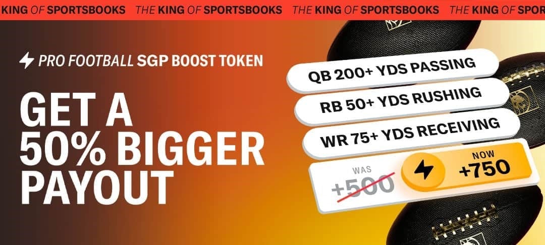 Place an SGP wager on any pro football game (maximum stake of $10). If you win your boosted parlay, you’ll see a 50% boost to your take! You must activate the token in your Bet Slip before placing your wager, and your parlay must have at least 3 legs.