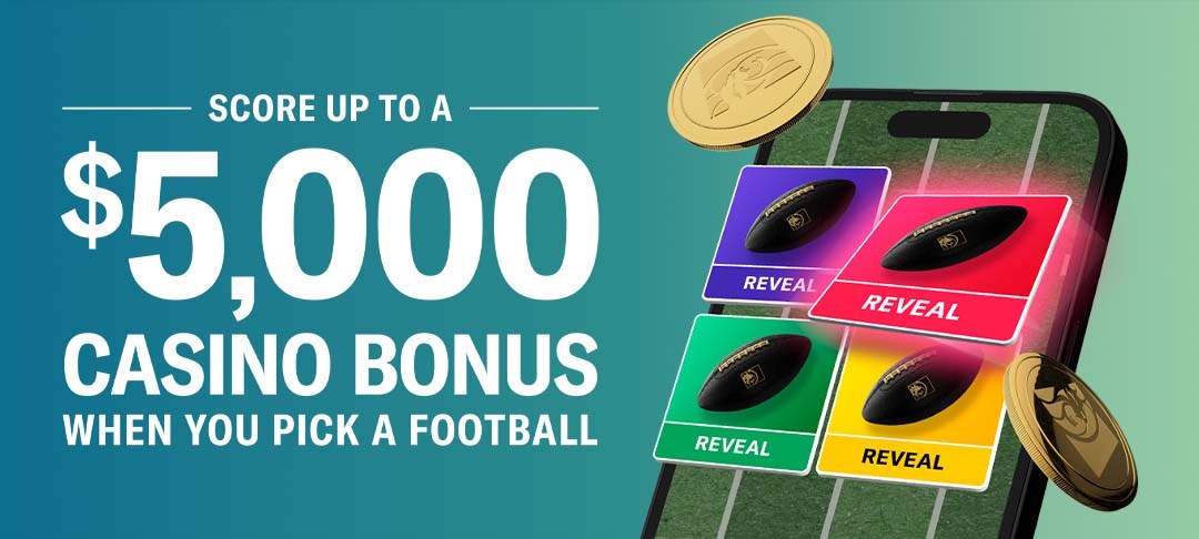 Simply bet $10 on football. Then, pick 1 of the footballs presented and you’ll win a Casino Bonus, up to $5,000, or Bonus Spins.